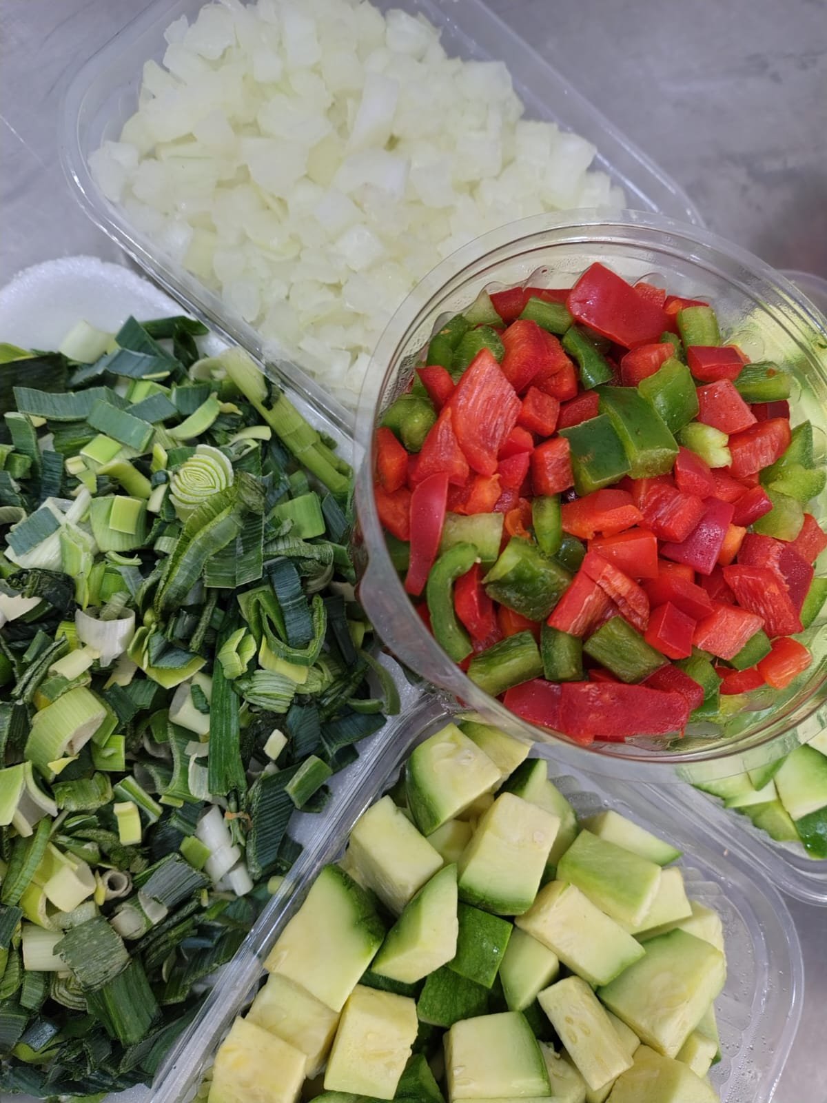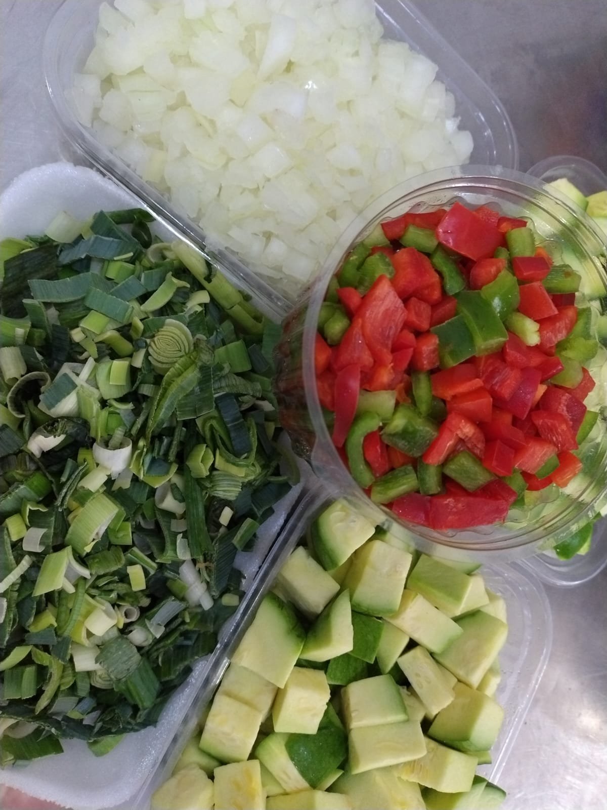 Zapallitos cubitos 1k + cebolla cubo 1/2 + morron cubo pote 350 gr + puerro rodajitas 200 gr